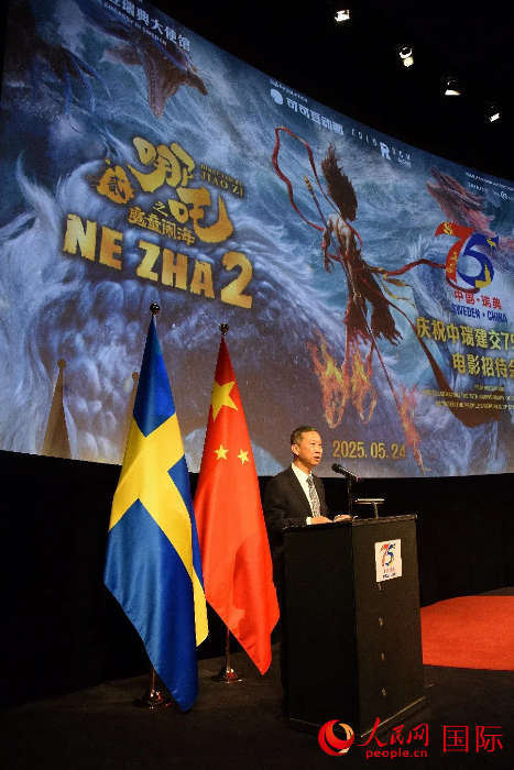 人民网斯德哥尔摩5月24日电 (记者殷淼)当地时间5月24日,中国驻瑞典大使馆在瑞典电影学院举办庆祝中瑞建交75周年电影招待会。中国驻瑞典大使崔爱民出席招待会并致辞。瑞各界友人和旅瑞侨胞、中资机构、留学生代表等600余人齐聚一堂,畅叙友谊,共同观赏国产动画电影《哪吒2》。