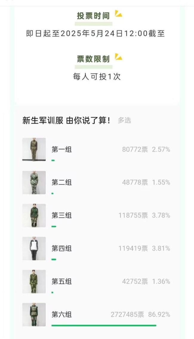 近日,山东轻工职业学院号召大家为2025级新生挑选军训服装。由于6个参赛作品各具特色,吸引了上百万人投票。截至5月24日中午12点投票结束,共有313万余人参与,其中272万余人投票给了最显眼的6号军训服。有网友评论道:“助力每一个梦想,期待返图。”