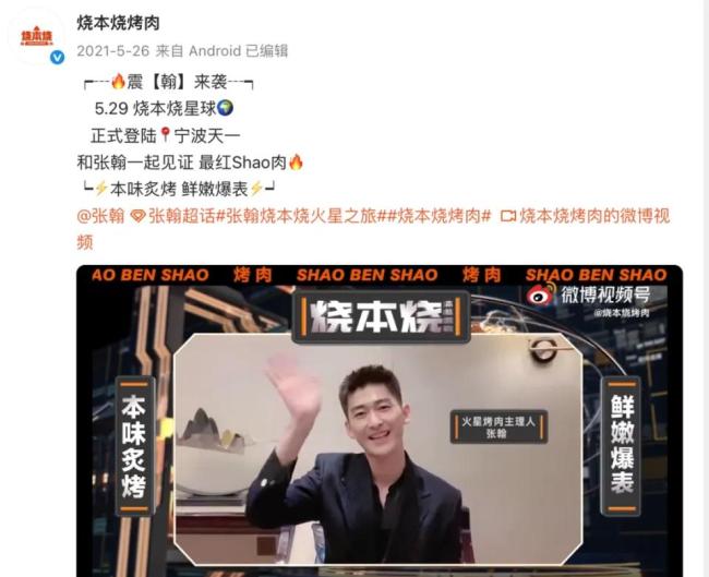 烧本烧烤肉门店以“火星探索”为主题,采用橙色主调、火山石地面、金属装置和宇航员元素,打造沉浸式用餐体验,受到年轻消费者的欢迎。2021年5月,“烧本烧”全球首店在宁波开业,张翰担任“火星烤肉主理人”,并与张柏芝、李治廷等明星及众多网红、KOL一同参与发布会。由于张翰的明星效应,该店尚未开业便登上大众点评宁波实时榜“综合榜”和“商户榜”榜首。