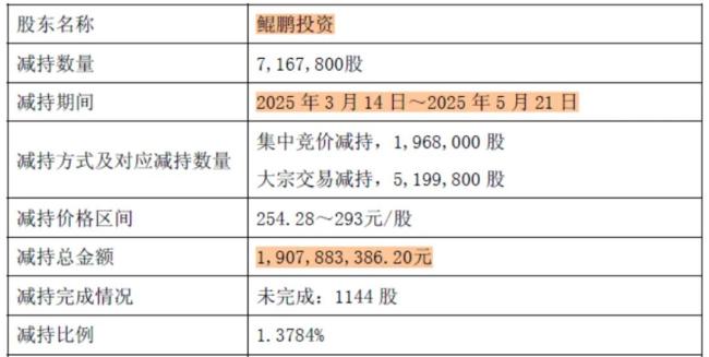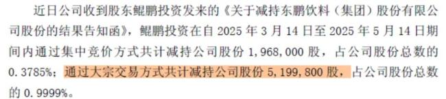 2025年5月21日盘后,东鹏饮料(605499.SH)披露一则减持结果公告,显示第三大股东鲲鹏投资在今年3月14日-5月21日期间,合计减持了716.78万股,减持金额高达19.08亿。