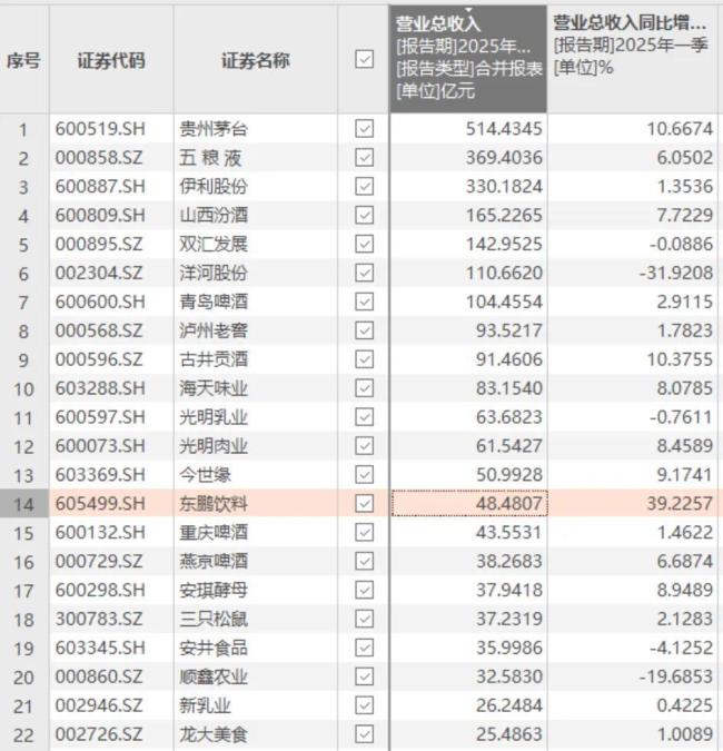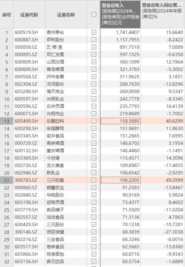 翻看整个食品饮料行业(参考申万行业分类2021),体量与东鹏相当、且2024年营收增速超过东鹏的上市公司,只有三只松鼠(300783.SZ)一家,其他大多是个位数增速,甚至是负增长。
