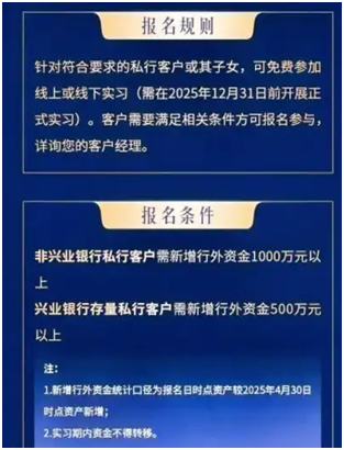 根据宣传图片,非兴业银行私行客户需新增行外资金1000万元以上才能报名;而兴业银行存量私行客户则需新增行外资金500万元以上。此外,实习期内资金不得转移。目前,该实习计划的文章已在兴业私行公众号上无法找到。兴业银行工作人员确认了这一实习计划的存在,但表示报名已经结束。