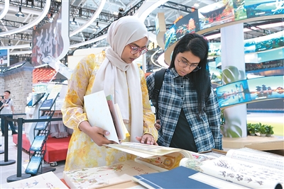 观众在文博会现场翻看展品。