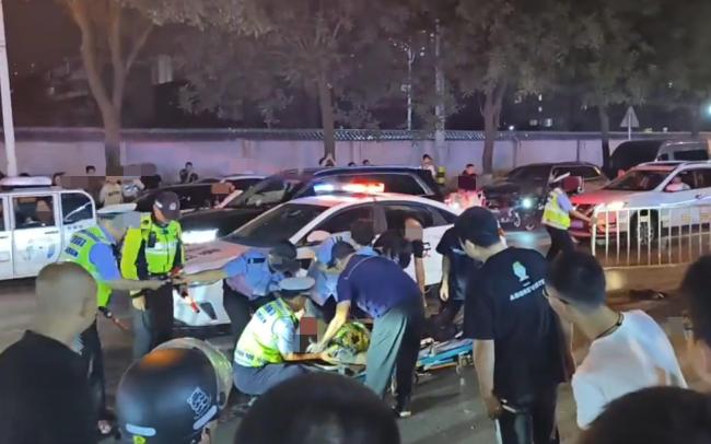 多段视频显示,道路中间护栏受损,一名交警倒地不起。一辆黑色车辆的车头受损,斜停在烧烤摊旁。多名交警在现场处置,120救护车将受伤交警送医,肇事车辆随后被拖走。