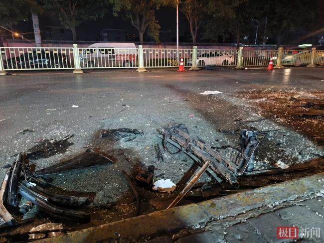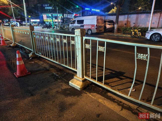 28日3时,事发现场位于文景南路与农兴路十字附近,道路已恢复通行,受损的几节护栏用铁丝暂时连接,路边散落着汽车零件和玻璃碎碴。