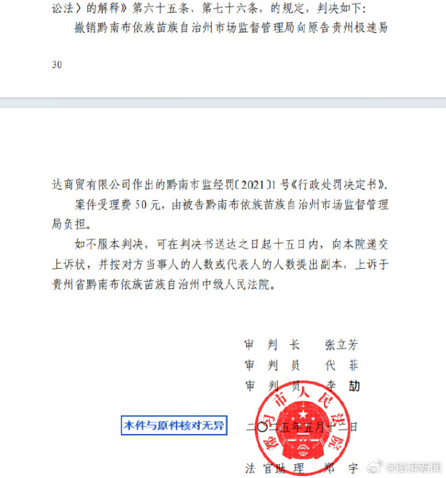 茅台经销商被罚后起诉市监局续:法院重审一审撤销处罚决定