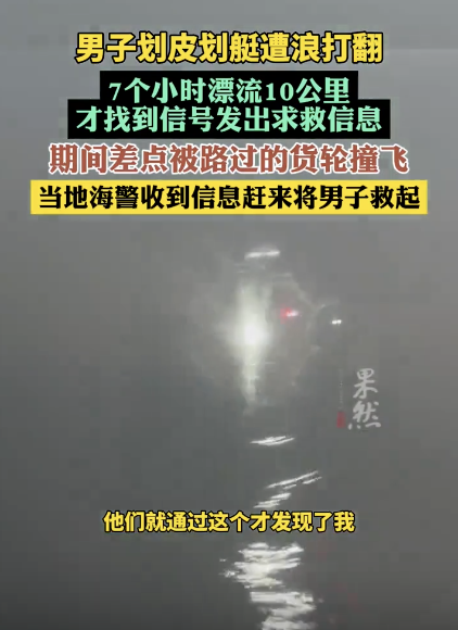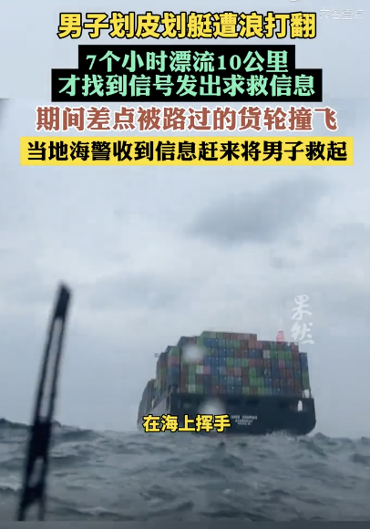 皮划艇被浪打翻男子海上漂流7小时:差点被路过的货轮撞飞