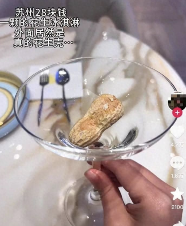 花生壳里塞冰淇淋卖28一个 真果壳制成引争议!近日,一位女子发布视频称,在苏州一家餐厅遇到了价格高昂的冰淇淋。她提到,一份装在花生壳里的冰淇淋售价28元,分量却少得惊人。尽管服务员会帮忙切开,仪式感十足,但她认为并不值这个价格。