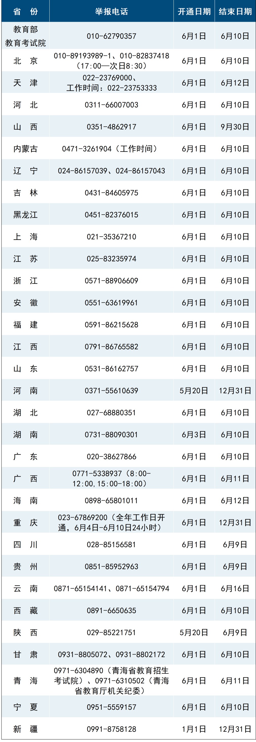 教育部和各省(区、市)开通2025年高考举报电话