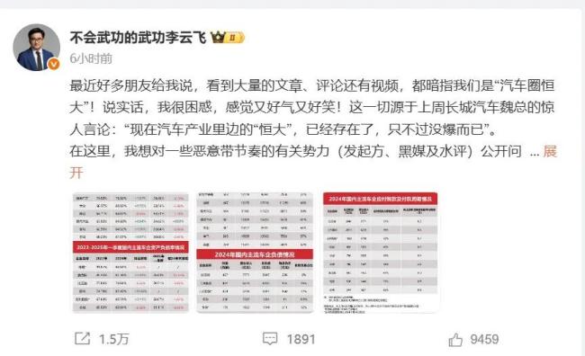 在微博长文中,李云飞以数据来说明比亚迪在经营、资本上都处于健康状态。对于有人将比亚迪等于“车圈恒大”,他表示对于这种言论是无稽之谈。李云飞对比亚迪的质疑源头来自长城魏建军上周的“惊人言论”。他对此抨击说,“中国主流车企根本不存在所谓的“车圈恒大”,任何唱衰中国新能源汽车的言论都是不可取的!”