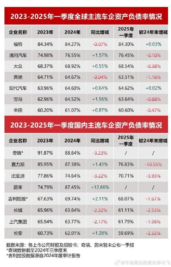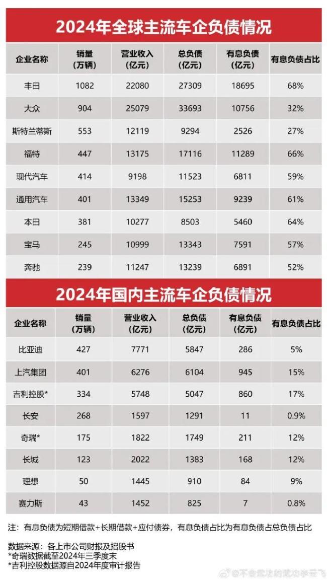 他还表示,看负债重点要看“有息负债”(即需要支付利息的债务,比如借银行的钱或是发行债券等)。以最新年报为例,比亚迪是286亿,吉利是860亿、上汽是945亿、丰田是1.8万亿、福特是1.1万亿、大众1万亿。“比下来,是不是我们中国车企更健康?”李云飞说。