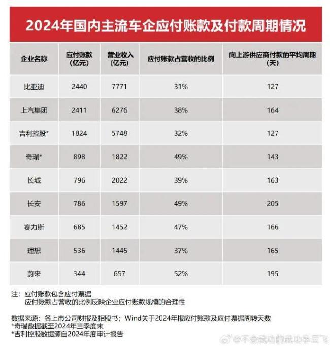 “其实一个企业应付账款多不多,还要看应付账款占营业收入的比例,这个比例越低,说明未支付的货款比例越小。我们是31%、吉利是32%、上汽是38%、长城是39%。”李云飞说。