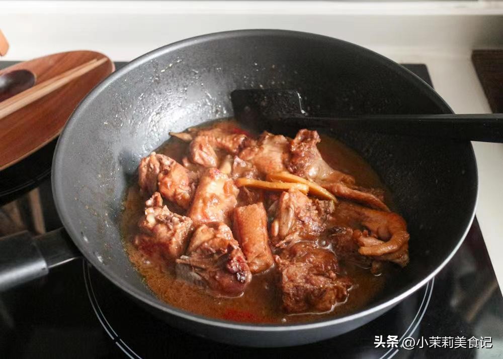 4、重新将锅烧热放油,鸭肉倒里边,快速炒,其中的水分被烹出去。丢一些生姜,梅子丁倒里边,炒匀后调些生抽,再加点冰糖炒匀,接着放热水,没过鸭肉。