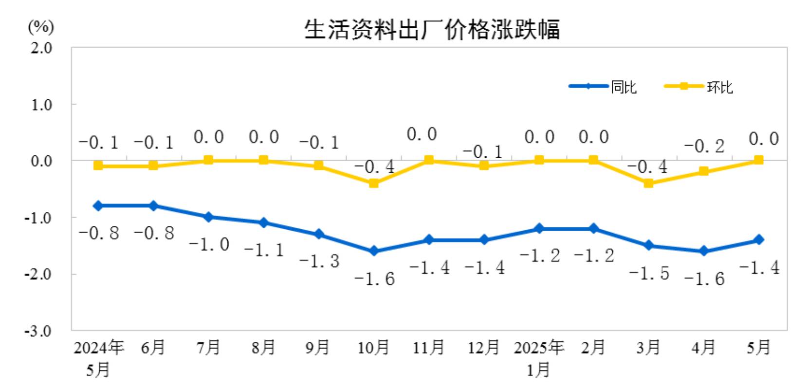 5月份,工业生产者出厂价格中,生产资料价格下降0.6%,影响工业生产者出厂价格总水平下降约0.44个百分点。其中,采掘工业价格下降2.5%,原材料工业价格下降0.9%,加工工业价格下降0.3%。生活资料价格持平。其中,食品价格下降0.1%,衣着价格上涨0.2%,一般日用品和耐用消费品价格均上涨0.1%。