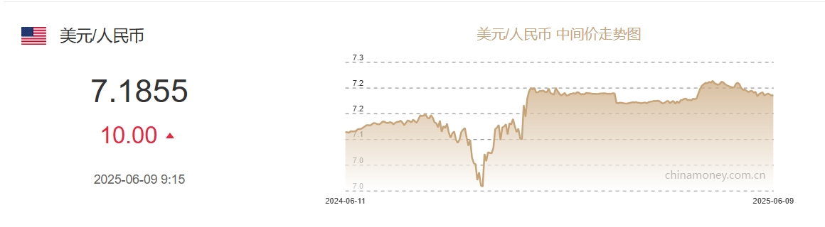 6月9日人民币对美元中间价报7.1855元 下调10个基点