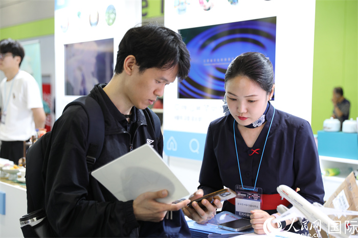 一位韩国参观者在东方航空展台前咨询。人民网记者 莽九晨摄