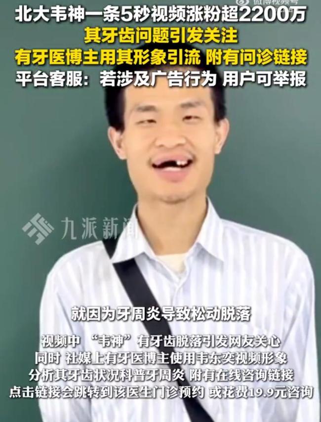 韦东奕健康问题不该被肆意消费 尊重学者拒绝流量狂欢。近日,韦东奕注册了社交媒体账号,发布了一段4秒的露脸视频。视频中他半排牙齿脱落的情况引起了网友对其健康的担忧。社交媒体上已有牙医博主使用韦东奕视频截图分析其牙齿状况,并科普牙周炎相关知识。这些科普视频附有在线咨询链接,点击后可预约该医生门诊或进行在线图文咨询。此外,还有一些口腔机构借机发布视频称:“韦神讲课被牙疼打断”,并提供牙周基础治疗套餐特惠。