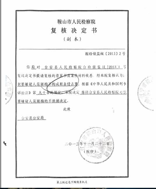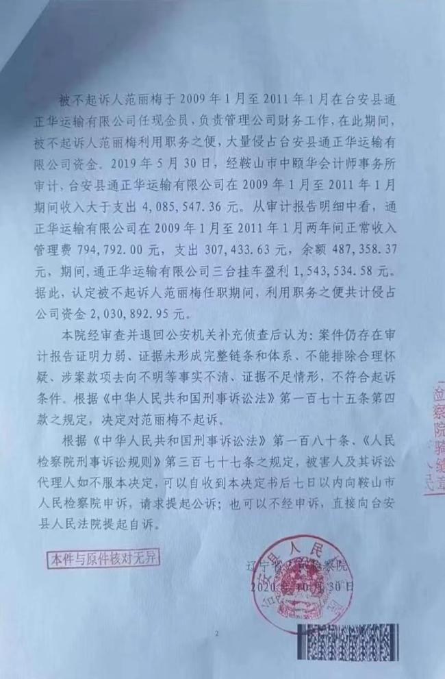 范某明是台安县通正华运输有限公司的法定代表人。2012年,范某明向警方报案称,其亲姐姐范丽梅侵占公司财产。2012年10月,范丽梅因涉嫌职务侵占罪被台安县公安局刑事拘留。范丽梅的丈夫周先生提供的多份材料显示,在此后近10年时间里,台安县检察院曾多次不批准逮捕范丽梅,鞍山市检察院亦认为范丽梅不构成职务侵占罪。直到2022年7月,因“发现新证据”,范丽梅再次被刑拘,台安县检察院也撤销原不起诉决定。同年底,台安县检察院向台安县法院提起公诉。