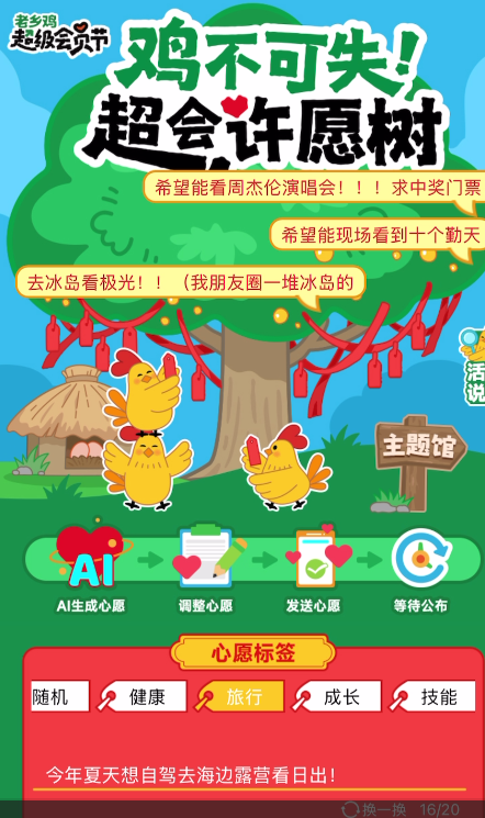 今年,在首年活动的基础上,老乡鸡再创“帮超会实现心愿”的玩法。在老乡鸡小程序上发起“鸡不可失·超会许愿树”活动,会员参与活动即有机会被实现愿望。在老乡鸡小程序上,数万人参与许愿活动。会员将活动分享到微博和小红书平台,还有机会获得额外奖励。在微博、小红书等平台,“帮超会实现心愿”活动也引发了十万级参与和超过4000条的用户自创内容。