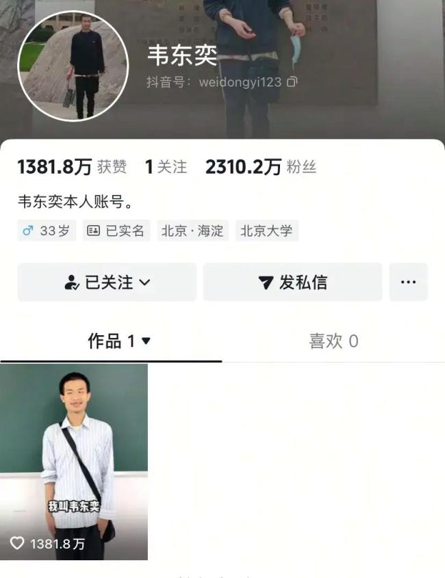 曝北大希望韦神注销账号!高考前夕,北京大学数学科学学院研究员韦东奕在社交平台上开设个人账号,并发布了一条时长仅为4秒的视频,迅速吸引了大量网友的关注。截至6月9日10时30分许,他的粉丝数量已突破2310万。