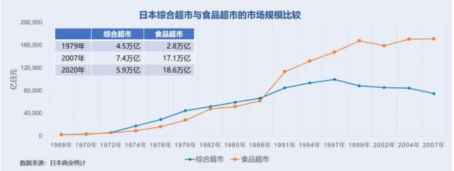 1974年,日本最早的食品超市关西超市诞生。此后,伴随着人口结构、经济状况的变化,消费者对于加工食品需求不断增加,食品超市逐步成为主流零售业态。1991年,整体规模就超过了综合超市。