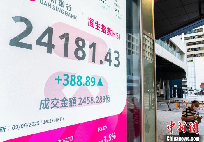 6月9日,香港恒生指数涨388.89点,涨幅1.63%,收报24181.43点。全日主板成交2458.28亿港元。中新社记者 侯宇 摄