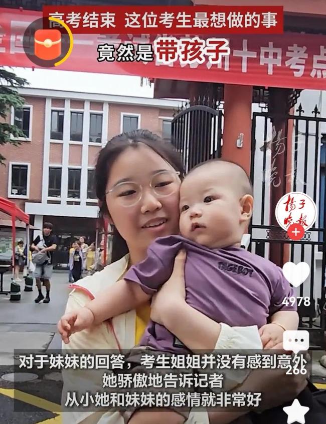 这名考生说的带孩子并不是家里的“二宝”,而是比她大9岁的姐姐的孩子。与此同时,她的姐姐也为她准备了一份特别的惊喜,和爱人带着提前准备好的硕大的易拉宝海报和鲜花迎接着她,姐妹俩双向奔赴的爱让人感动。