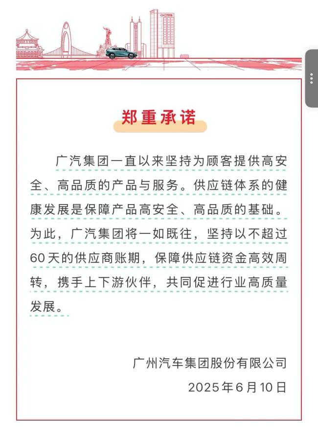 广汽集团于6月10日晚在其官方公众号发布声明,承诺将继续保持不超过60天的供应商账期,以保障供应链资金高效周转,并与上下游伙伴共同促进行业高质量发展。随后,中国一汽、东风汽车、赛力斯集团、吉利汽车集团、长安汽车、比亚迪汽车、奇瑞集团和小鹏汽车等多家车企也发布了类似承诺,将供应商支付账期统一至60天。