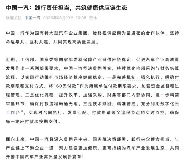 一汽集团共提出了三大措施:一是完善机制,强化执行。明确付款期限和支付方式,将“60天付款”作为所属单位付款期限要求,加强资金监督和过程管理。二是优化流程,提升效率。加强采购、财务等部门内部协同,进一步精简审批环节,确保付款流程畅通无阻。三是技术赋能,精准管控。充分利用数字化云工作台,实现对合同执行、发票匹配、付款申请等全流程节点的实时监控,确保每一笔应付款项按期支付。