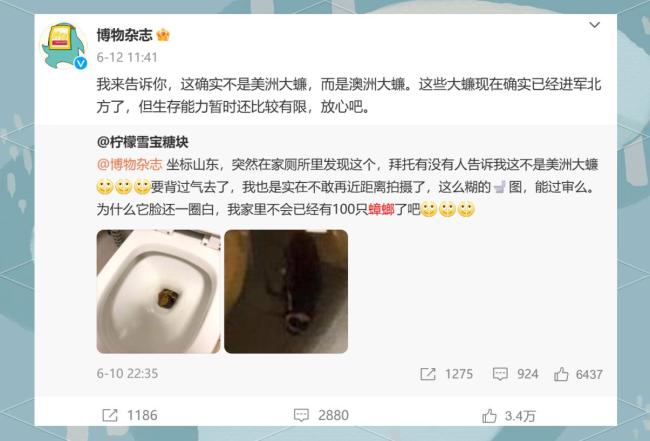 不仅在北京,山东济南、陕西、甘肃、青海、新疆等北方地区也纷纷出现了大蟑螂。一位济南网友在微博上询问《博物》杂志,得知家中马桶出现的虫子是澳洲大蠊,即大蟑螂。许多网友表示自己也曾目睹过大蟑螂的身影,“南蟑北调”的现象已然形成。