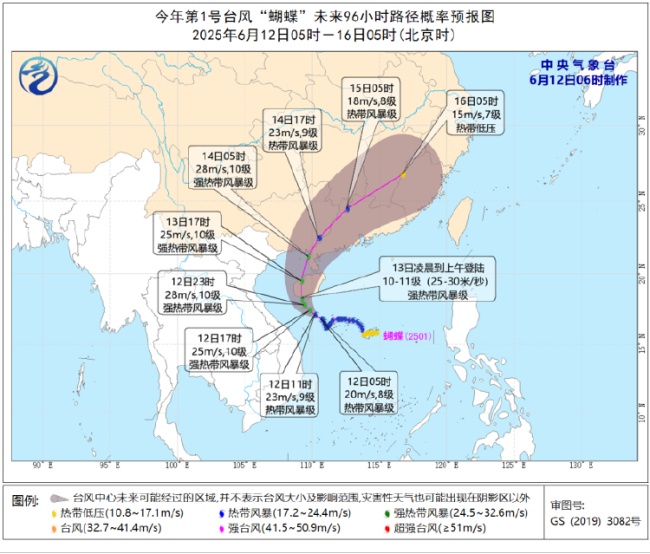 预计台风“蝴蝶”将于13日凌晨到上午在海南陵水至乐东一带沿海登陆,登陆时强度为强热带风暴级(10~11级,25~30米/秒),14日白天将在广东西部到广西沿海再次登陆。受其影响,6月12日至14日,华南大部将有大到暴雨,局地大暴雨或特大暴雨。其中,6月12日08时至13日08时,广东北部和中西部沿海、海南岛大部、台湾岛有大雨或暴雨,部分区域有大暴雨。南海大部、北部湾、琼州海峡、西沙群岛、南沙群岛、中沙群岛、广东沿海、海南岛沿海、广西沿海将有6~8级风,阵风9~10级,台风中心经过的附近海域风力可达9~11级,阵风12~13级。