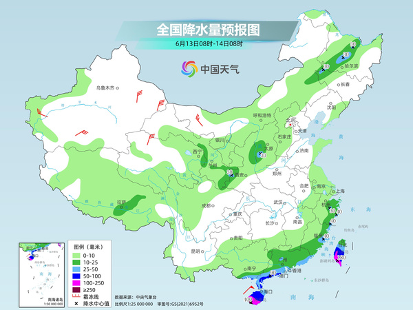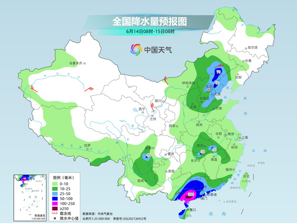 后天,内蒙古东部、江南中东部和南部、华南中北部等地部分地区有大到暴雨,其中,江西东部、广东北部等地部分地区有大暴雨,广东北部等地局地特大暴雨。