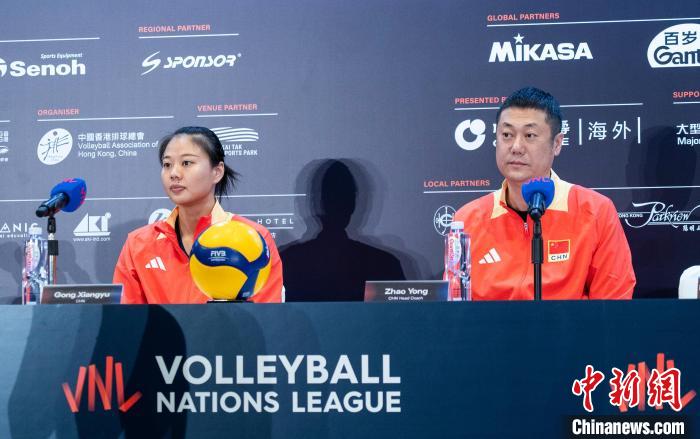 本站赛事将于6月18日至22日在全新的香港启德体育园启德体艺馆举行。图为中国女排主教练赵勇(右)和队长龚翔宇出席发布会。中新网记者 侯宇 摄