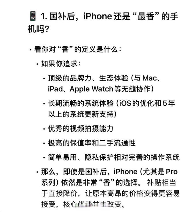 临近618,在国补的加持下,怎样选到一款心仪的手机成了技术活。就国补后iPhone还是最香机,以及什么档位的手机用国补最划算的问题,通过询问了DeepSeek、文心一言、豆包等AI软件发现,DeepSeek认为,从品牌力与生态体验、优秀的拍摄能力、保值率和二手流通率,以及操作系统方面来说,国补后的iPhone依然非常香;豆包认为,国补后部分型号iPhone价格达到历史低价,但在某些功能上,如快充、影像特色功能上,iPhone可能不占优势。如果你有购机需求,不妨看看它们的意见。