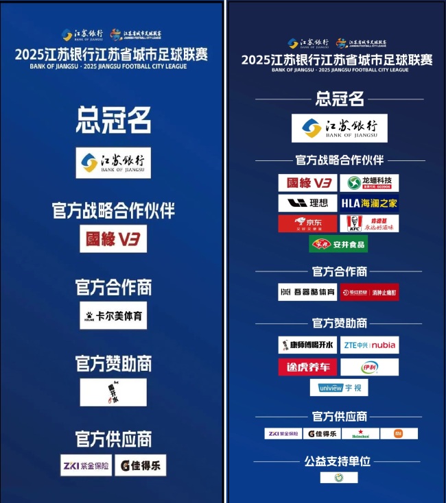当前,“苏超”的赞助商除了总冠名依然是江苏银行。其官方战略合作伙伴除国缘V3外,还有龙蟠科技、理想、海澜之家、京东、肯德基、安井;官方合作商包括吾器酷体育、花红药业消肿止痛酊;官方赞助商除康师傅喝开水外,增加了中兴Nubia、途虎养车、伊利、宇视;官方供应商除紫金保险、佳得乐外,增加了喜力啤酒、小米。