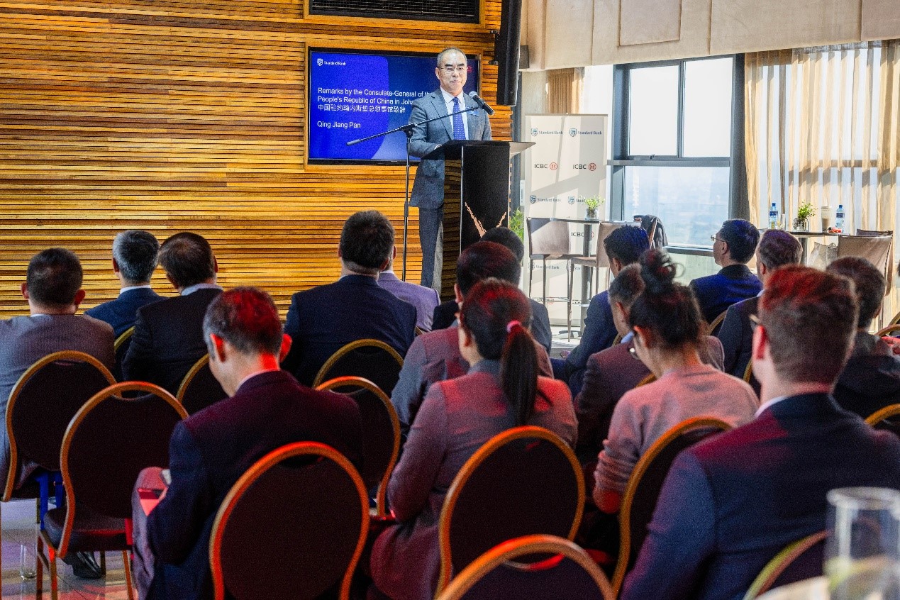 中国驻约翰内斯堡总领馆潘庆江总领事致辞。工行非洲代表处供图