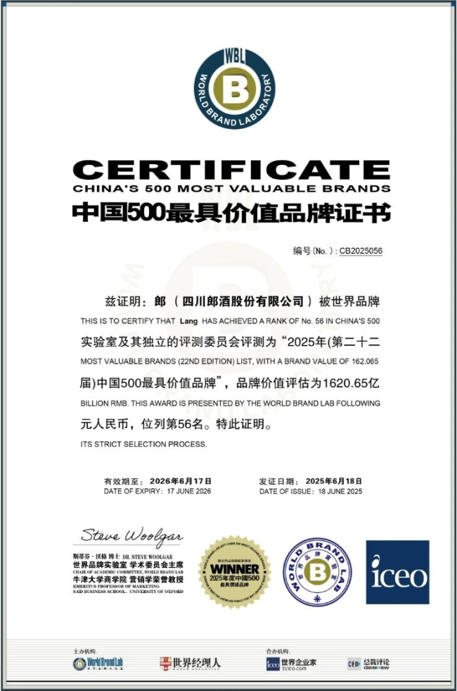 从2004年世界品牌实验室首次公布的41.52亿元,到品牌价值1620.65亿元、连续17年稳居白酒行业前三、酱香型白酒第二,郎酒以持续进化的品牌生命力,书写着中国白酒的全球突围叙事,为产业变革注入不可复制的“中国郎范式”。