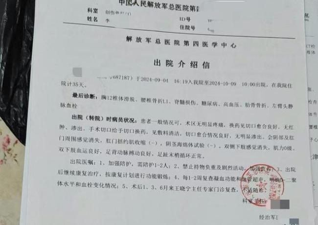 据中国人民解放军总医院第四医学中心2024年9月29日出具的出院介绍信显示,李先生最后被诊断为胸12椎体滑脱、腰椎骨骨折L1、脊髓损伤、肋骨骨折等。