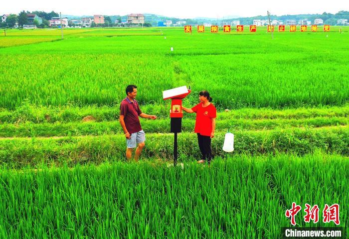 中新网永州6月20日电(杨万里 唐涛)走进湖南永州市零陵区富家桥镇贤水河两岸万亩高标准双季稻种植示范片,只见稻田中排列着太阳能杀虫灯、诱捕器。