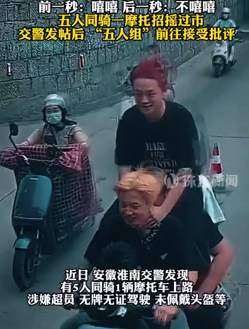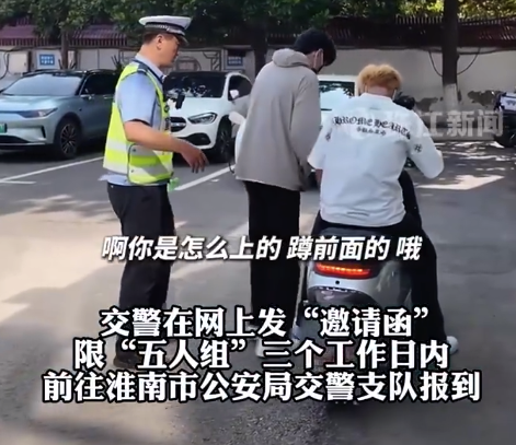 近日安徽淮南交警发现,有5人同骑1辆摩托车上路,涉嫌超员、无牌无证驾驶、未佩戴头盔等。交警在网上发“邀请函”,限“五人组”三个工作日内,前往淮南市公安局交警支队报到。5人随后“应邀”前往接受批评教育,交警让其重现“5人同骑”场景。在征得家长同意后,警方将摩托车留在交警队,等待后续处理。
