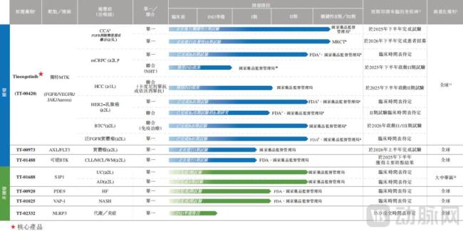 其核心产品Tinengotinib(TT-00420)是一种处于注册临床阶段、自主发现及开发的独特MTK抑制剂,可靶向治疗若干复发或难治、耐药实体瘤。其靶向三个关键通路,即FGFR/VEGFR、JAK及Aurora激酶。通过靶向一种或一组通路,Tinengotinib可靶向广泛的癌症类型。与FGFR的独特结合模式使Tinengotinib能够克服多克隆突变,使其靶向FGFR引起的癌症(如FGFR变异的胆管癌及泛FGFR实体瘤),而关键通路的独特组合使其能够对多种癌症类型(包括前列腺癌、肝细胞癌、乳腺癌及胆道癌)有效。