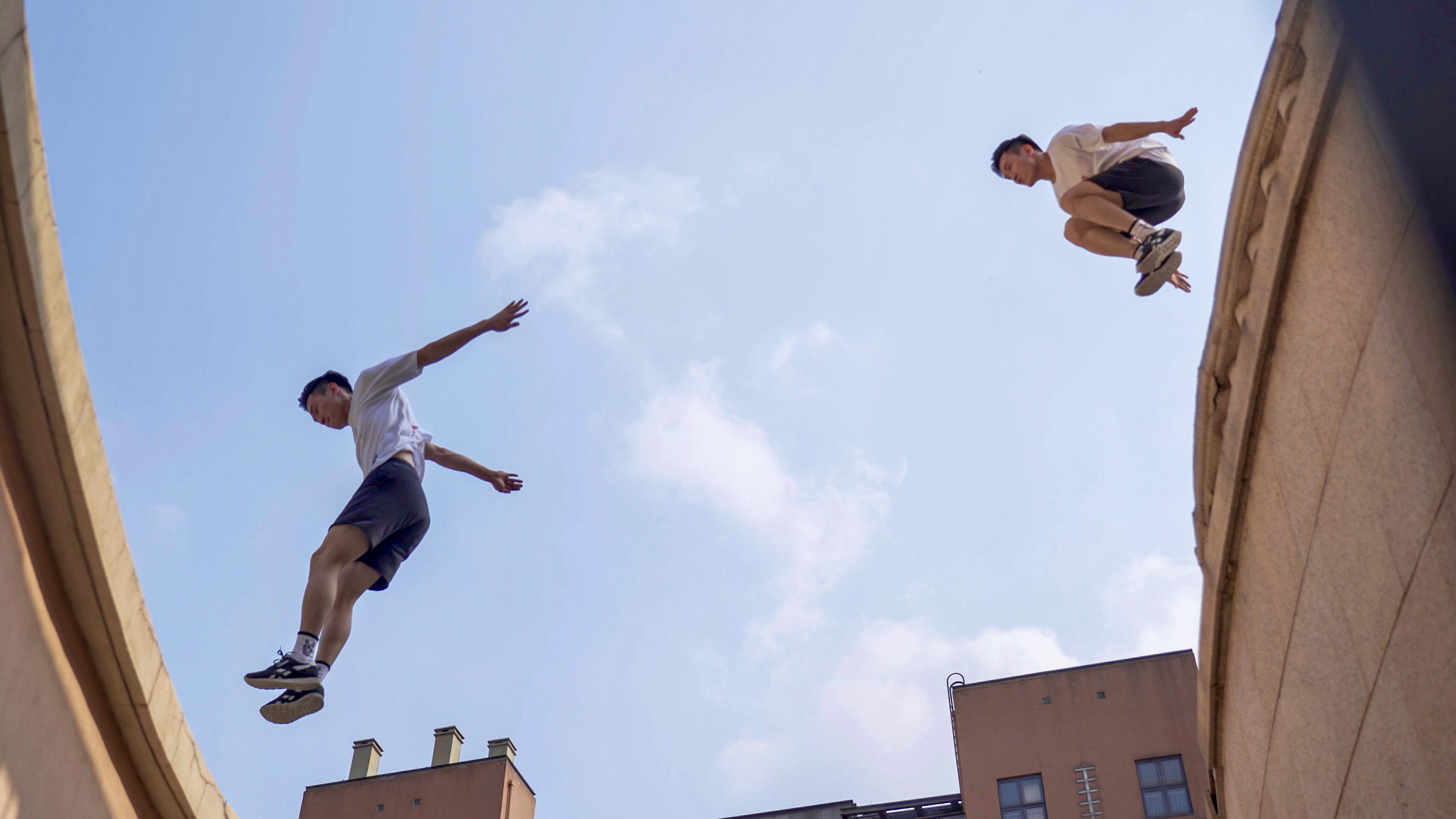 跑酷运动员丁雄烁从小是功夫迷,2009年他偶然接触到跑酷,从此沉迷于此。他认为跑酷的诞生,就是希望人类不局限于直立行走、跑步这些常规动作,而是利用循序渐进的方式去解锁更多可能,让身体变得更加灵活、更加强壮。
