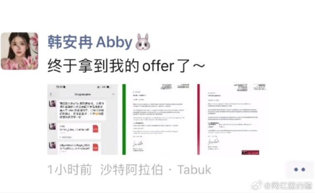韩安冉晒硕士offer:终于圆了自己的大学梦了