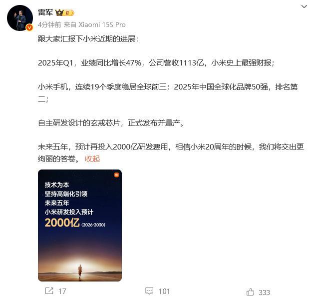 6月26日晚,小米创办人、董事长兼CEO雷军在其个人微博上分享了公司近期的进展。他表示,2025年第一季度,小米业绩同比增长47%,营收达到1113亿,创造了小米历史上最强劲的财务表现。小米手机连续19个季度稳居全球前三,并在2025年中国全球化品牌50强中排名第二。此外,小米自主研发设计的玄戒芯片也已正式发布并量产。