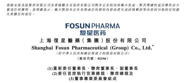 6月24日,复星医药完成董事会换届,宣布系列人事任命:陈玉卿获重新委任为董事长;关晓晖获重新委任为联席董事长;文德镛获重新委任为副董事长;刘毅获委任为首席执行官兼总裁;李静、Xingli Wang、Wenjie Zhang获委任为联席总裁等。