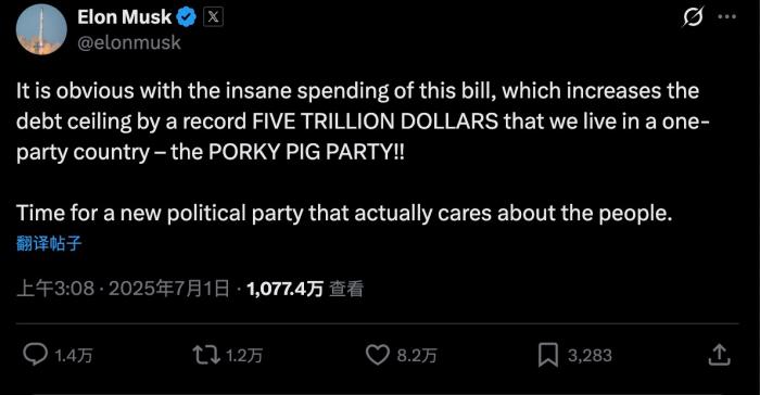 再次痛批“大而美”法案 马斯克又提建新政党