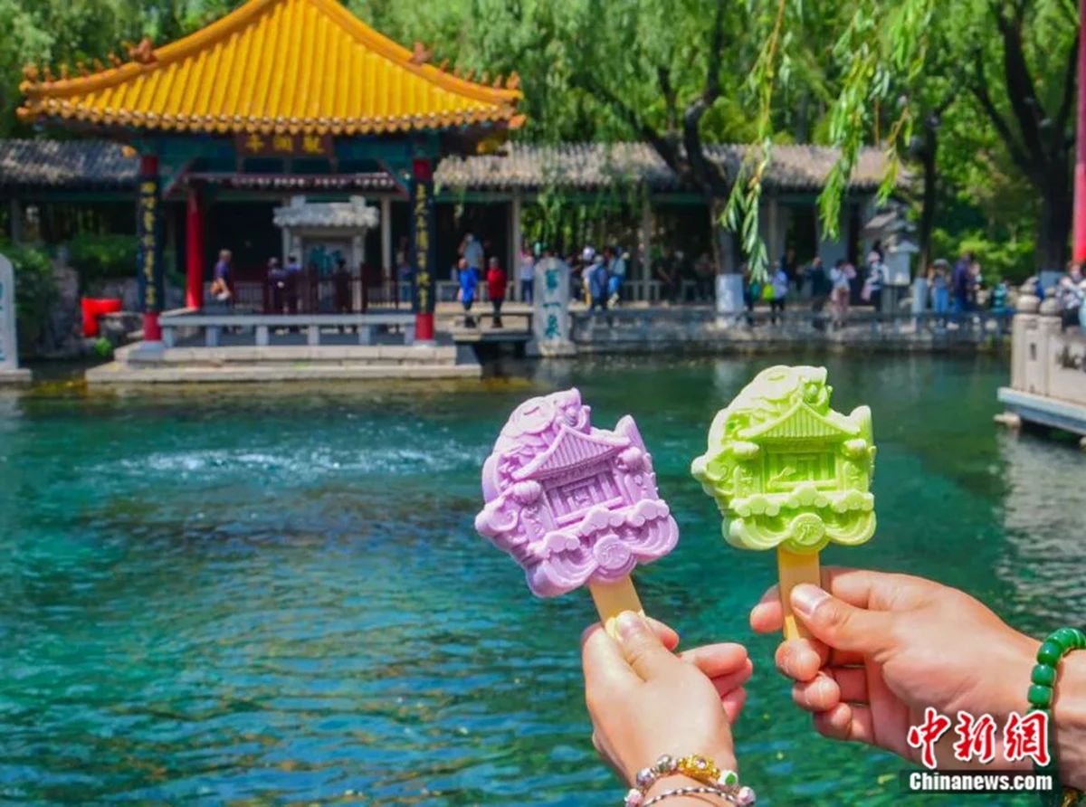 游客在济南趵突泉晒文创雪糕。济南市文旅局供图 王琴 摄
