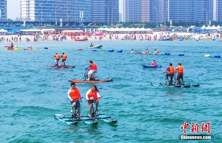 游客们在威海荣成一处海水浴场,体验各种水上娱乐项目。李信君 摄
