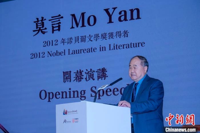 2024年11月28日,香港大学中国制度研究中心,同时也作为由香港大学、北京大学和中国社会科学院共同创建的历史与文明研究基地的秘书处举办首届历史与文明国际论坛,来自全球逾40名享誉国际的历史和文化学者齐聚香港大学,共同探讨变动世界中的文明共生。图为诺贝尔文学奖得主莫言作开幕演讲。 中新网记者 陈永诺 摄