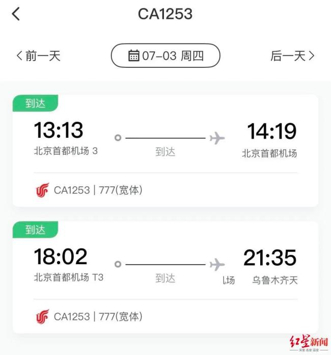 随后,国航App记录显示,CA1253次航班在7月3日18:02重新从北京首都机场起飞,并于当天21:35飞抵乌鲁木齐。国航客服人员提到,该架次航班在返航后进行了调整,后续重新起飞。